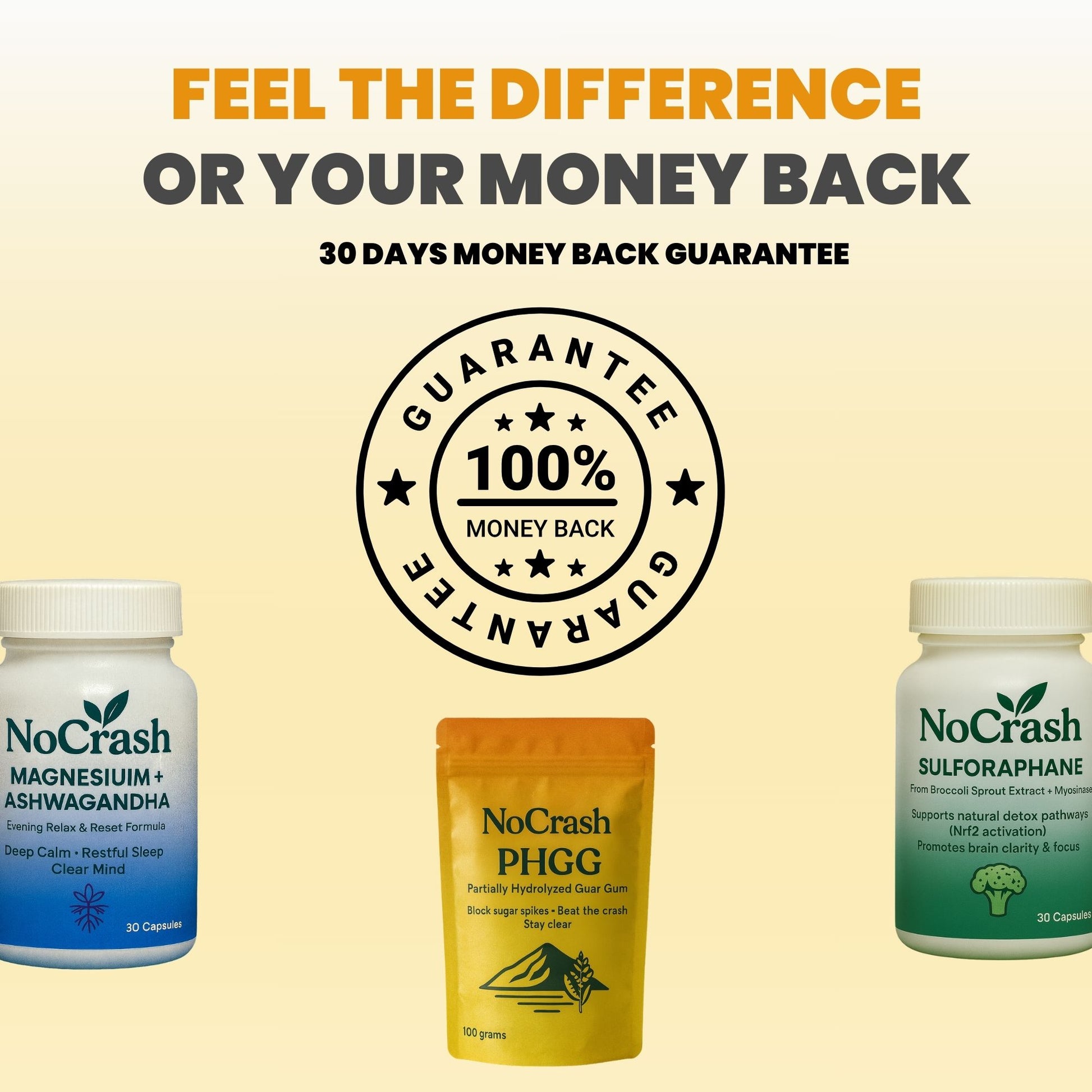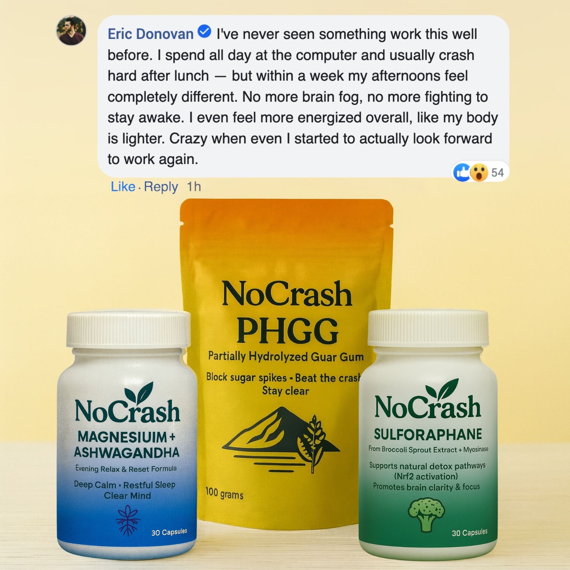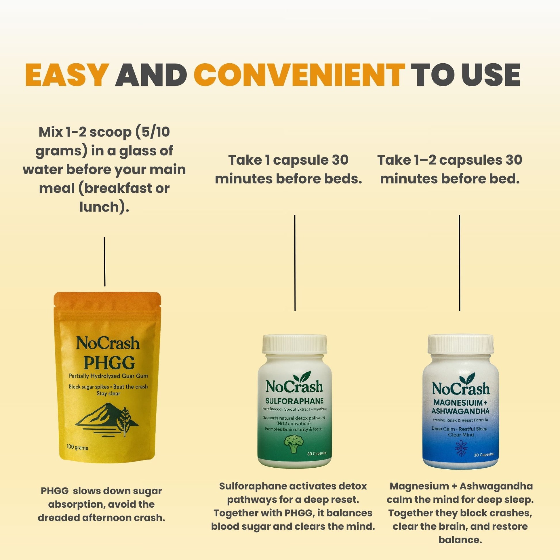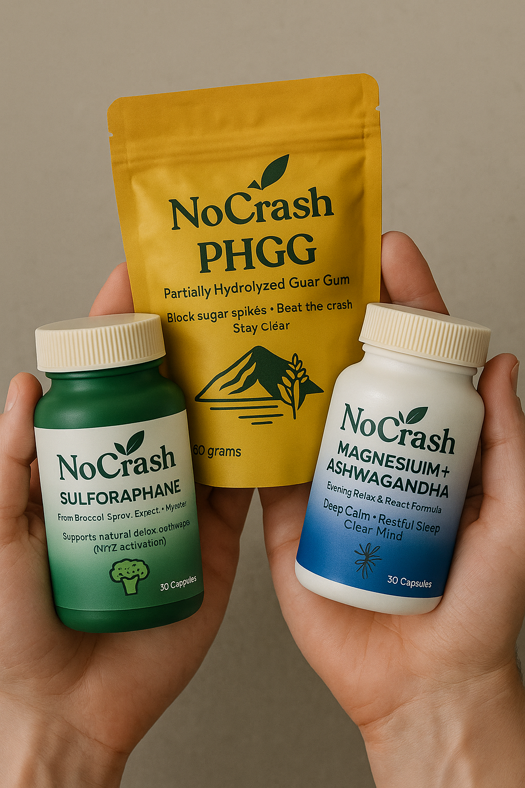 NoCrash does the opposite—a tight bundle of essentials (PHGG, Sulforaphane, Magnesium + Ashwagandha) at real doses with a clear AM/Lunch/PM protocol.